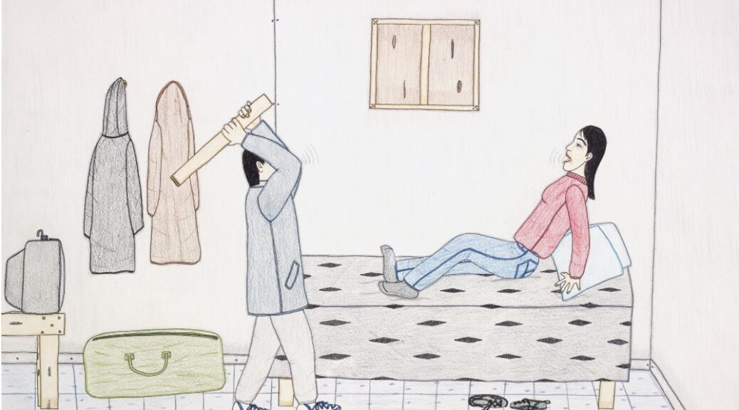 Featured image- Annie Pootoogook, Man Abusing His Partner, 2002 Coloured pencil and ink on paper, 51 x 66.5 cm Collection of John and Joyce Price