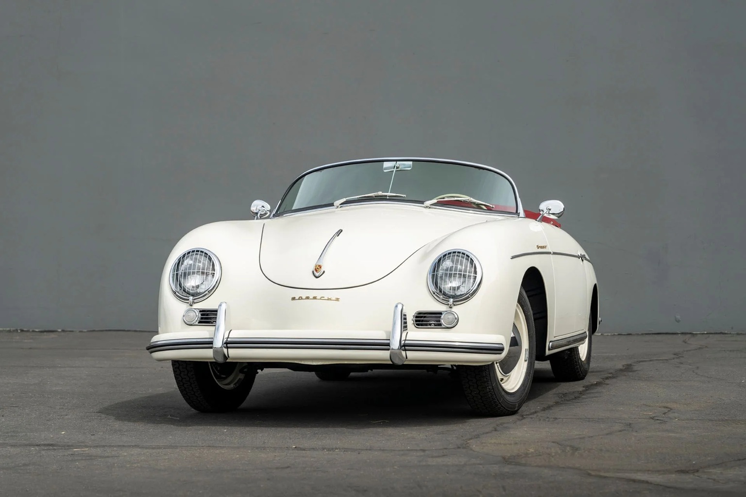 Today, this Speedster appears just as Max Hoffman and the Porsche factory intended: in elegant White over Red, with such details as accessory chrome guards protecting the sealed-beam headlights, period-style Michelin XZX 165 tires, and gold-tone badging serving as clear indicators as the quality of its restoration. A matching red vinyl boot (trunk) covers the occasional soft top when it’s folded. Inside, the red vinyl bucket seats made famous by the Speedster wear contrasting ivory edge piping. A correct ivory two-spoke steering wheel with a horn ring frames a body color dashboard covered with a red upholstered top. VDO instruments feature with correct green lettering — including a miles-per-hour speedometer, as specified in the original Kardex. In a smart nod to modernity, the car is equipped with a pair of vintage style lap belts. Otherwise, Speedster chassis number 82181 presents very much as it did when delivered new in 1956 — down to its exquisite color selection.