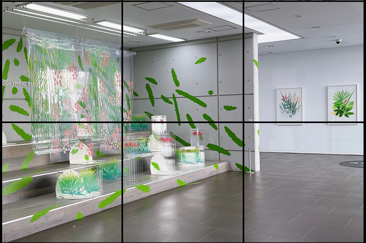 The exhibit features a set of six framed drawings taken from the 2023 pavilion, as a nod to the previous exhibition and a collaborative lithography commissioned for this project.