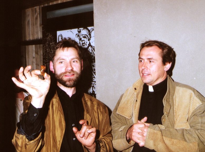 Featured image: The priest E.Atkočiūnas showcases Museum amber with ancient mosquito inclusions.