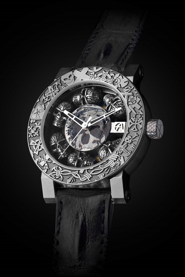 This is surrounded by six hand-engraved skulls in polished steel outlined in black. The style is at once tribal and urban, modern and ancestral. ArtyA leaves the interpretation of this universal symbol to each individual’s imagination. By definition, each timepiece will be unique, with each person free to have their own take on the skull universe.