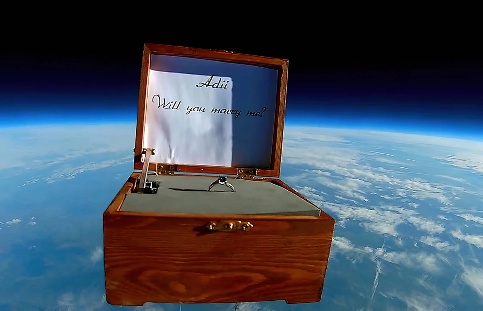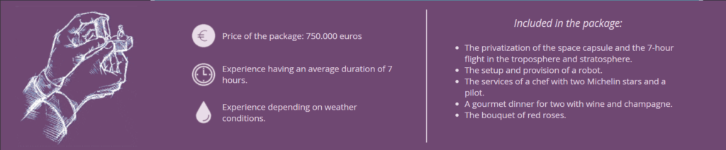 The agency ApoteoSurprise, specialized in orchestrating extravagant marriage proposals in Paris, is launching a brand-new service priced at 750,000 euros/ $1.1 million cad, allowing the romantics of tomorrow to ask for their beloved’s hand at an altitude of 35 kilometers. Upon their arrival at the spaceport, a pilot will welcome the couple and invite them to board a spherical and futuristic space capsule equipped with top-notch amenities for their comfort. In the center of the cabin, a table will be elegantly set, reminiscent of the most refined Parisian restaurants. The lovers will be introduced to StellarEmbrace, the robot that ApoteoSurprise developed in collaboration with a British startup. Equipped with artificial intelligence, the robot will adapt to the emotions and desires of the couple, providing a truly unique interaction. From the moment they meet, StellarEmbrace will address the young woman by her name and, presenting her with a bouquet of roses, announce that a gourmet dinner for two in space awaits. Lifted by a helium-inflated stratospheric balloon, the pressurized capsule will then embark on a peaceful two-hour ascent, offering breathtaking 360° views of our planet through its immense windows. At an altitude of 35 kilometers, the space module will be above 99% of Earth’s atmosphere, allowing the couple to gaze at the curvature of the Earth, its blue halo, and the total darkness of space. Like only 600 astronauts before them, the lovers will experience the overview effect, a cognitive shift that will redefine their view of the world and connect them to all of humanity. The woman and her partner will take their seats at the table, and for three hours, the robot will serve them a five-course gourmet dinner with wines and champagne specially crafted for the occasion by a renowned French chef with two Michelin stars. A carefully selected playlist will accompany the culinary experience, featuring iconic tracks such as “Space Oddity” (David Bowie), “Across the Universe” (The Beatles), or “Walking on the Moon” (Police). Just before dessert, StellarEmbrace will playfully interrupt the tasting to inform the man that he has forgotten something important. The robot will promptly bring him a luminous box that a secret code will open. Suddenly, the suitor will remember the code and enter it. The box will split in two, revealing a luxurious case containing an engagement ring. The man will then propose to his beloved, sealing his love in the eternity of space. A little later, the capsule will begin its slow descent. After a two-hour journey, the betrothed will be back on Earth, discovering that the robot has recorded every moment of their voyage, from their arrival at the capsule to their tender farewells.
