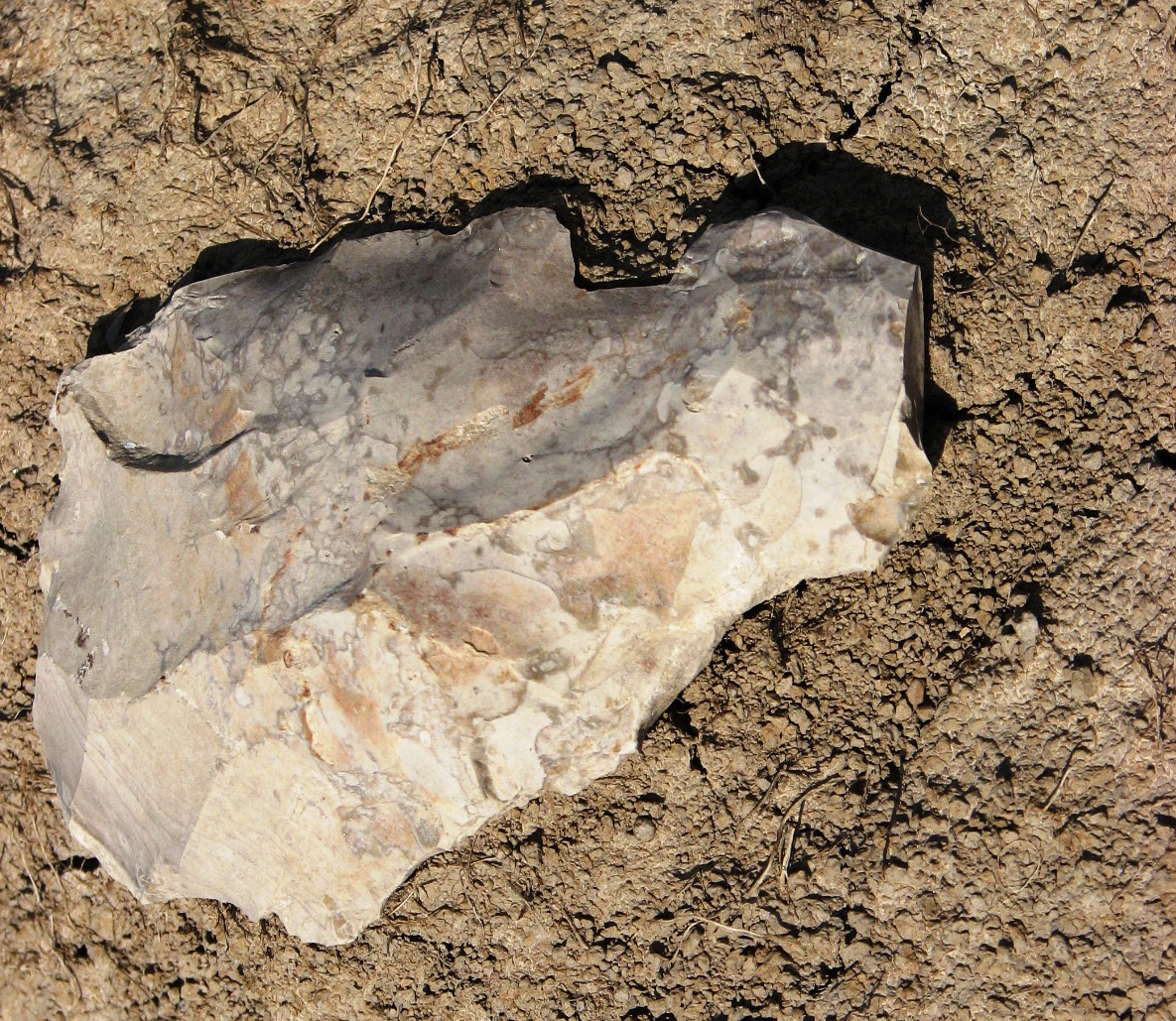 This photo shows a ‘feature’- where stone flakes were recovered from a flintknapping moment about 7,000 years ago.