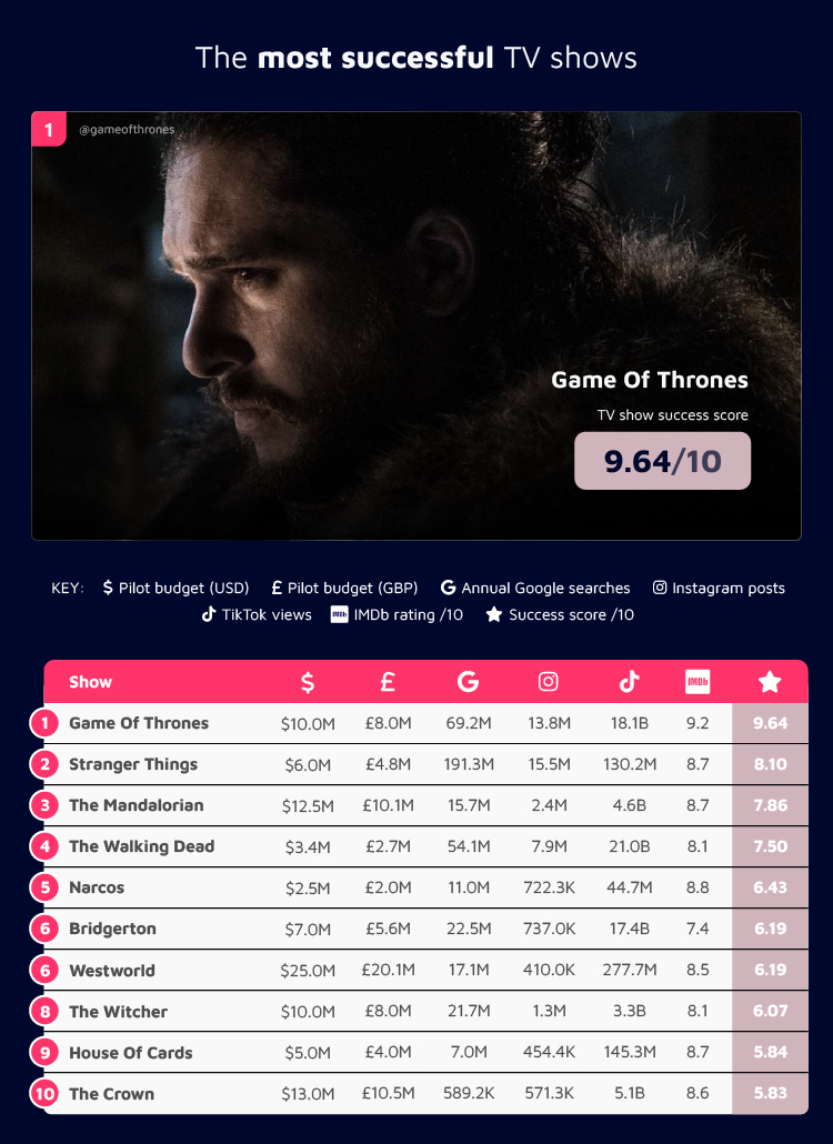 Our friends at Spin Genie have looked at a range of factors including the cost of the pilot episode, annual Google searches, number of Instagram posts and TikTok views as well as the IMDb rating of the world’s most popular TV series to determine the most successful series of all time.
