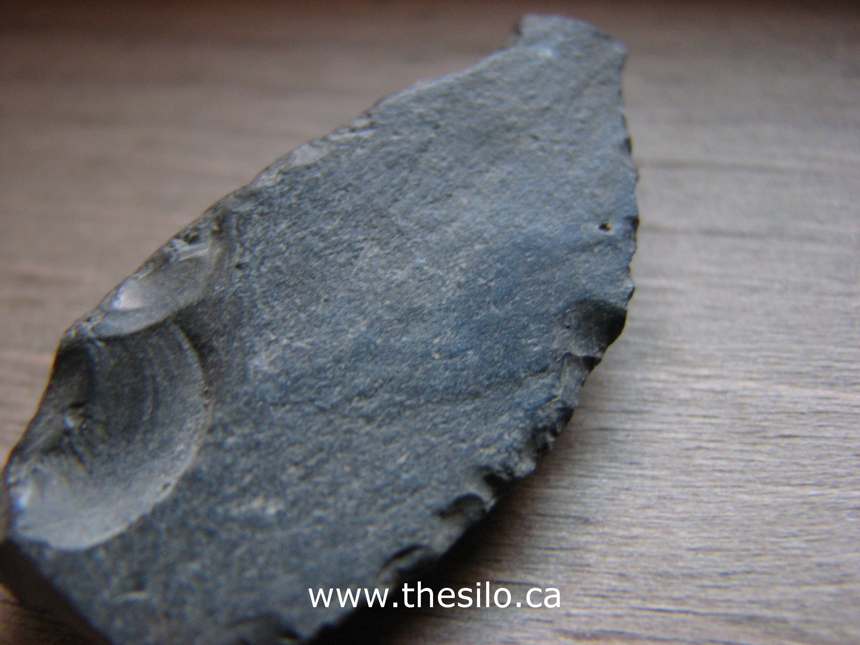 This stone shows signs of ancient human manufacture. Percussive bulbs result from being hammered and chipped, and facial flaking along the sides are strong indicators. It was retrieved in April 2010 from the then drained shoreline of Silver Lake millpond in Port Dover, Ontario. In the vicinity of the stone were animal bones and glacial till.