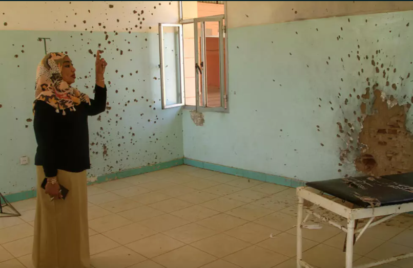 Photo: France24.com Hospital director Dr. Safaa Ali shows the bullet holes that still riddle the wards of the reopened Saudi hospital in Omdurman. © Ebrahim Hamid / AFP